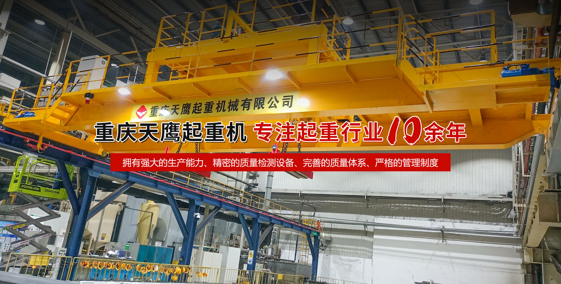 重慶天鷹起重機械有限公司成立于2014年,主營起重機的銷售、安裝和維護等相關服務。中國重型機械工業(yè)協(xié)會員單位、為中國工程機械工業(yè)協(xié)會工程機械維修分會會員單位及西南地區(qū)起重機械定點安裝維修單位。具有國家質量監(jiān)督檢疫總局頒發(fā)的特種設備安裝維修改造質格證書。并率先通過了IS09001-2000質量體系認證。 公司注冊資金3000萬元;廠房面積2萬平方米;各種生產(chǎn)檢測設備50臺套,公司技術力量雄厚,聘請了國內(nèi)知名起重機專家、工程技術人員擔當項目經(jīng)理、技術總工程師及顧問。現(xiàn)擁有員工100多人,其中工程技術人員12人。 主導產(chǎn)品為各類橋、門式起重機及輕小型起重設備,具備生產(chǎn)起重量200t及以下通用橋、門式起重機的能力,尤其在200t以下起重機產(chǎn)品上具備較強的市場競爭力,為許多行業(yè)設計制造了技術含量高、技術性強的起重設備,許多產(chǎn)品在原設計標準上進行了較大的改進、優(yōu)化和創(chuàng)新;其中NH型系列電動葫蘆、HD型電動單梁處于國內(nèi)高水平..... 好的產(chǎn)品品質需要由較高的裝備水平來保證,公司購買了“大型數(shù)控落地鏜”、“數(shù)控切割機床”、“自調(diào)式焊接滾輪機”、“數(shù)顯液壓板料折彎機”、“超大型數(shù)控臥式車床”、“數(shù)控液壓水平下調(diào)式三輥卷板機”、“單柱移動式立式車床”“擁有用于單梁生產(chǎn)的全國一條拋丸噴漆烘干線、葫蘆噴漆烘干線和全國較大的100T葫蘆試驗臺和檢測中心”等各種先進的加工設備,新建廠房面積近2萬平方米。 質量是企業(yè)的生命,天鷹公司依據(jù)“ISO 9001國際質量管理體系”標準,制定并完善了公司的質量管理體制。堅持質量體系的內(nèi)審和外審,將質量管理工作落實到企業(yè)生產(chǎn)經(jīng)營的全過程。 您的微笑,是天鷹永恒的追求;天鷹的服務,是您首要的選擇!因為我們堅信:“誠信是本、質量鑄就品牌”。為您服務是我們的榮耀,勤奮而進取的天鷹人,時刻期盼著您的到來。